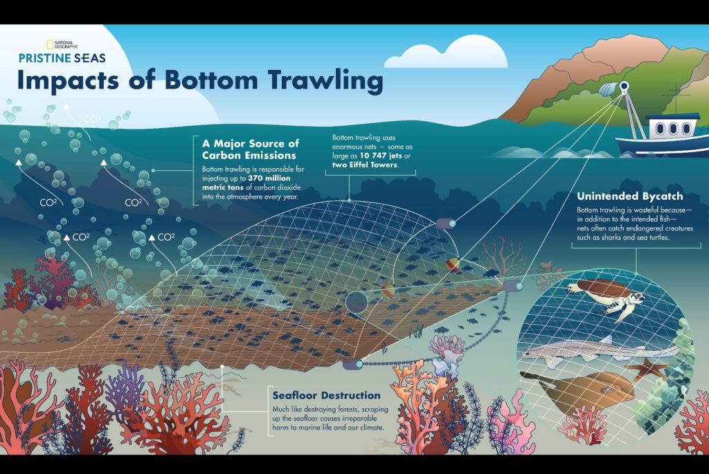 In fact, researcher Saïdi warns that these nets don’t just take fish. They destroy habitats. By crushing the seabed, they uproot seagrass meadows, coral, and other foundational ecosystems. Sediment is churned, increasing water turbidity and releasing buried contaminants.