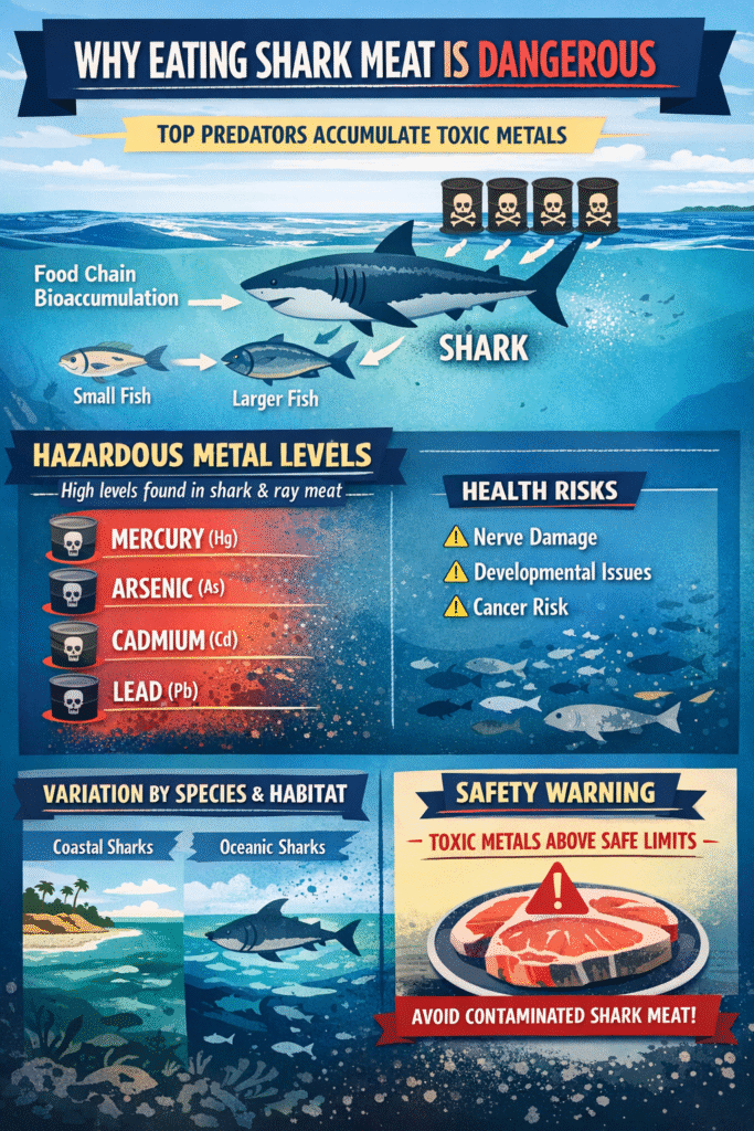 In addition , a recent PubMed study found that shark and ray meat sold for consumption often contains toxic metals like mercury, arsenic, cadmium, and lead at levels exceeding safety limits. These concentrations vary by species and habitat, with some coastal species showing higher contamination.